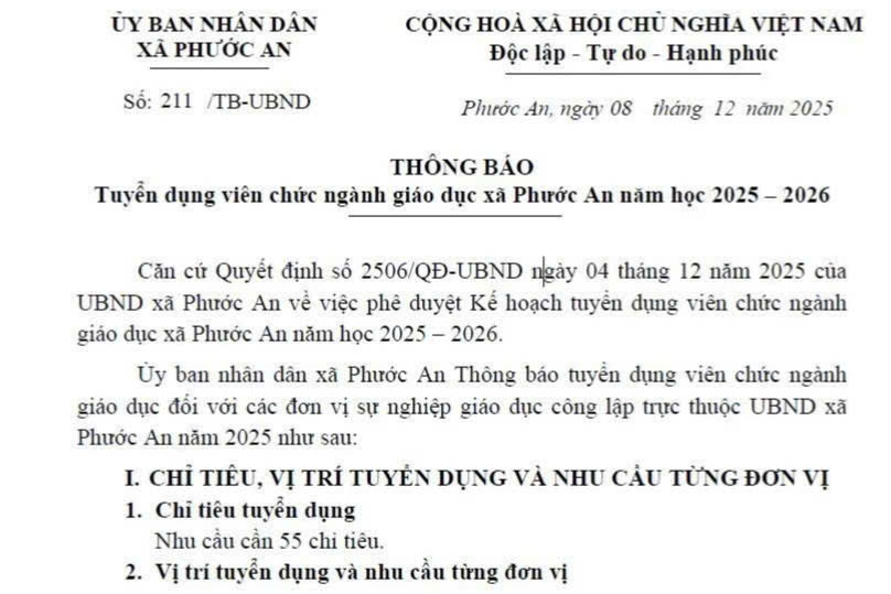 Tuyển dụng viên chức ngành giáo dục xã Phước An năm học 2025 – 2026