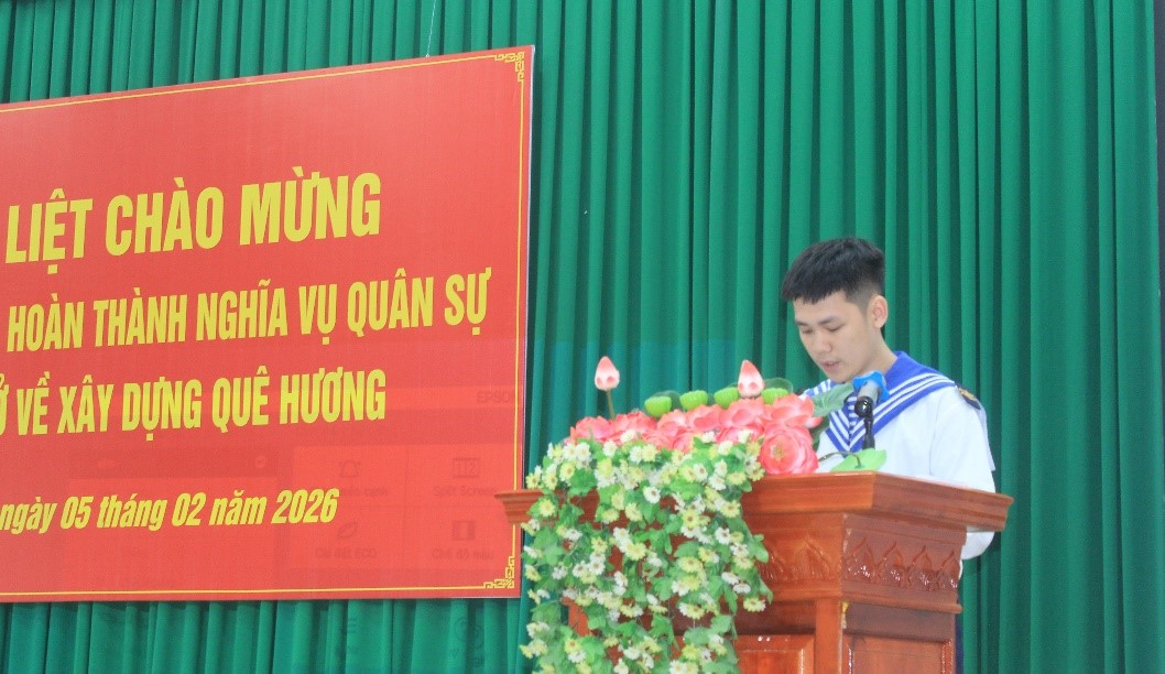 Thay mặt các quân nhân xuất ngũ, anh Lê Thế Khoa đã bày tỏ sự xúc động trước sự đón tiếp chu đáo của lãnh đạo chính quyền địa phương. Đồng thời cho biết, sau 2 năm rèn luyện trong quân ngũ, trở về gia đình và quê hương, bản thân rất tự hào và xin hứa sẽ tiếp tục phát huy tinh thần trách nhiệm, tham gia lực lượng dự bị động viên, sẵn sàng nhận và hoàn thành tốt mọi nhiệm vụ tại địa phương, gương mẫu trong lối sống và tích cực lao động sản xuất để không phụ sự kỳ vọng của cha anh.