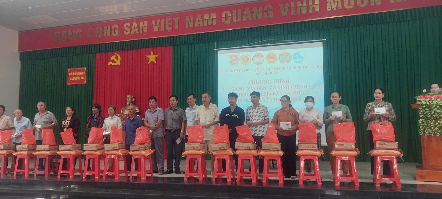 Sáng ngày 06/02/2026, tại Trung tâm Dịch vụ tổng hợp xã Phước An, Phòng Văn hóa – Xã hội phối hợp cùng Ủy ban Mặt trận Tổ quốc Việt Nam xã tổ chức chương trình trao 200 phần quà Tết cho các hộ gia đình chính sách, hộ nghèo và hộ có hoàn cảnh khó khăn trên địa bàn xã. Đây là đợt trao quà thứ 5 trong Kế hoạch chăm lo Tết cho nhân dân dịp Tết Nguyên đán Bính Ngọ năm 2026.