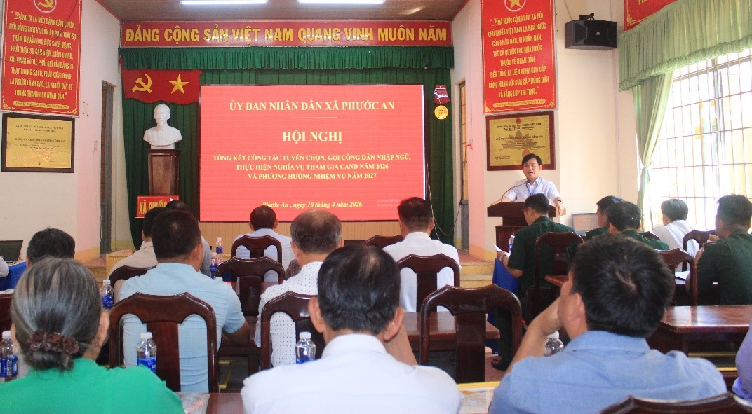 Sáng 10-4, tại Hội trường UBND xã Phước An, &nbsp;UBND xã tổ chức Hội nghị tổng kết công tác tuyển chọn, gọi công dân nhập ngũ và thực hiện nghĩa vụ tham gia Công an nhân dân năm 2026; đồng thời triển khai phương hướng, nhiệm vụ cho năm 2027.