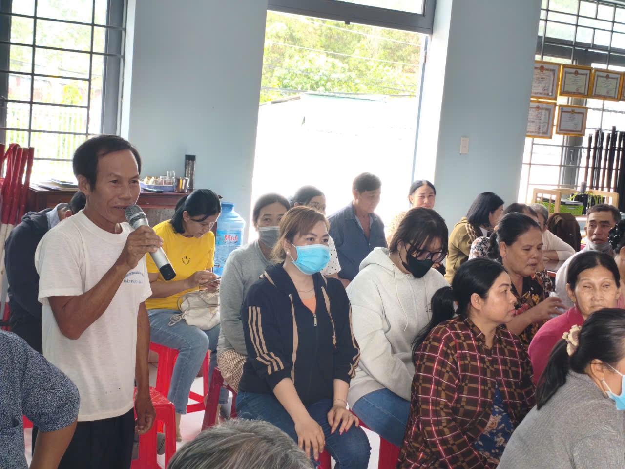 <figcaption>Cử tri Lưu Văn Lầu – ấp 3, đang đặt câu hỏi cho những người ứng cử tại Hội nghị tiếp xúc cử tri</figcaption>