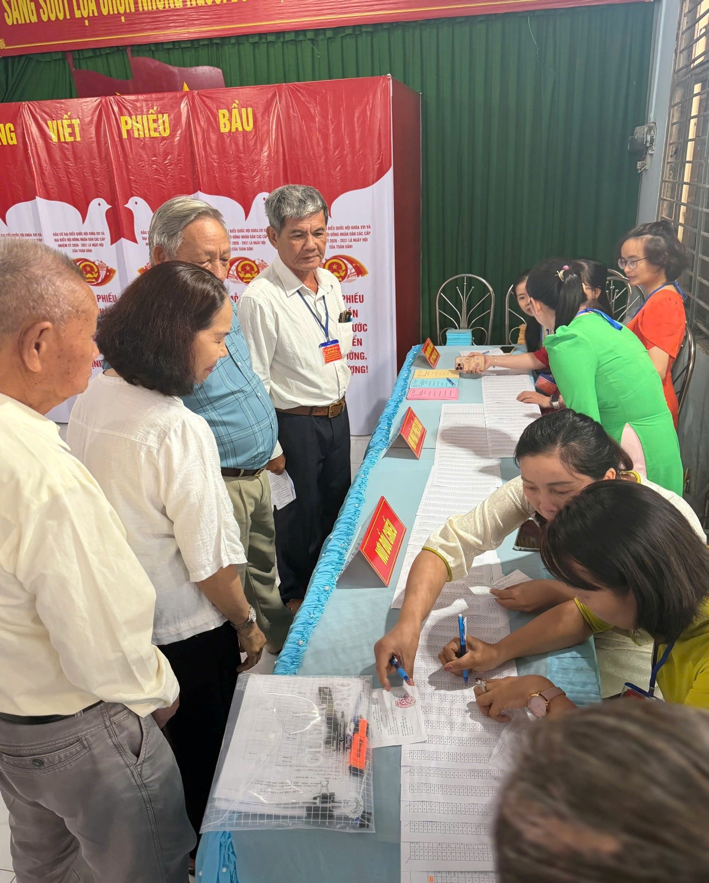 Ngay từ sáng sớm, tại các khu vực bỏ phiếu trên địa bàn xã, cờ Tổ quốc, băng rôn, khẩu hiệu được trang trí trang trọng, tạo nên không khí rộn ràng, phấn khởi. Cử tri trong trang phục chỉnh tề, hồ hởi đến các điểm bỏ phiếu, thể hiện tinh thần trách nhiệm và niềm tin đối với ngày hội dân chủ của toàn dân.