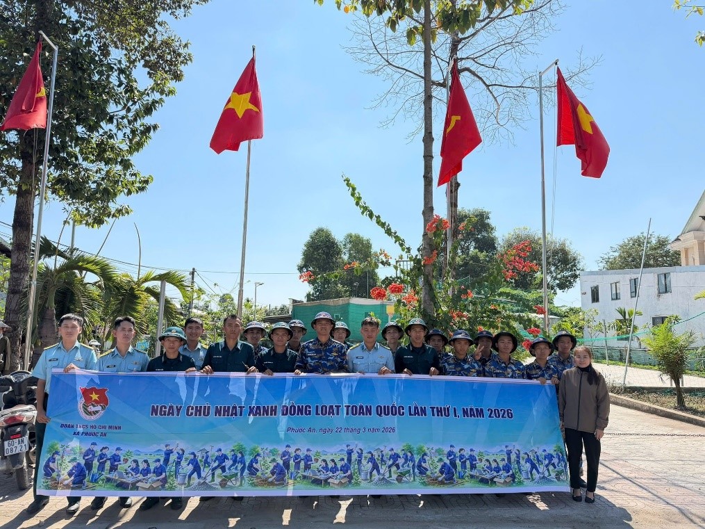 Sáng ngày 22-3, <a name="_Hlk225233283">Đoàn TNCS Hồ Chí Minh xã Phước An</a> phối hợp với đơn vị Trung tâm huấn luyện vùng 2 Hải quân và tiểu đoàn Tên lửa 44 đồng loạt ra quân hưởng ứng “Ngày Chủ nhật xanh” lần thứ I năm 2026.