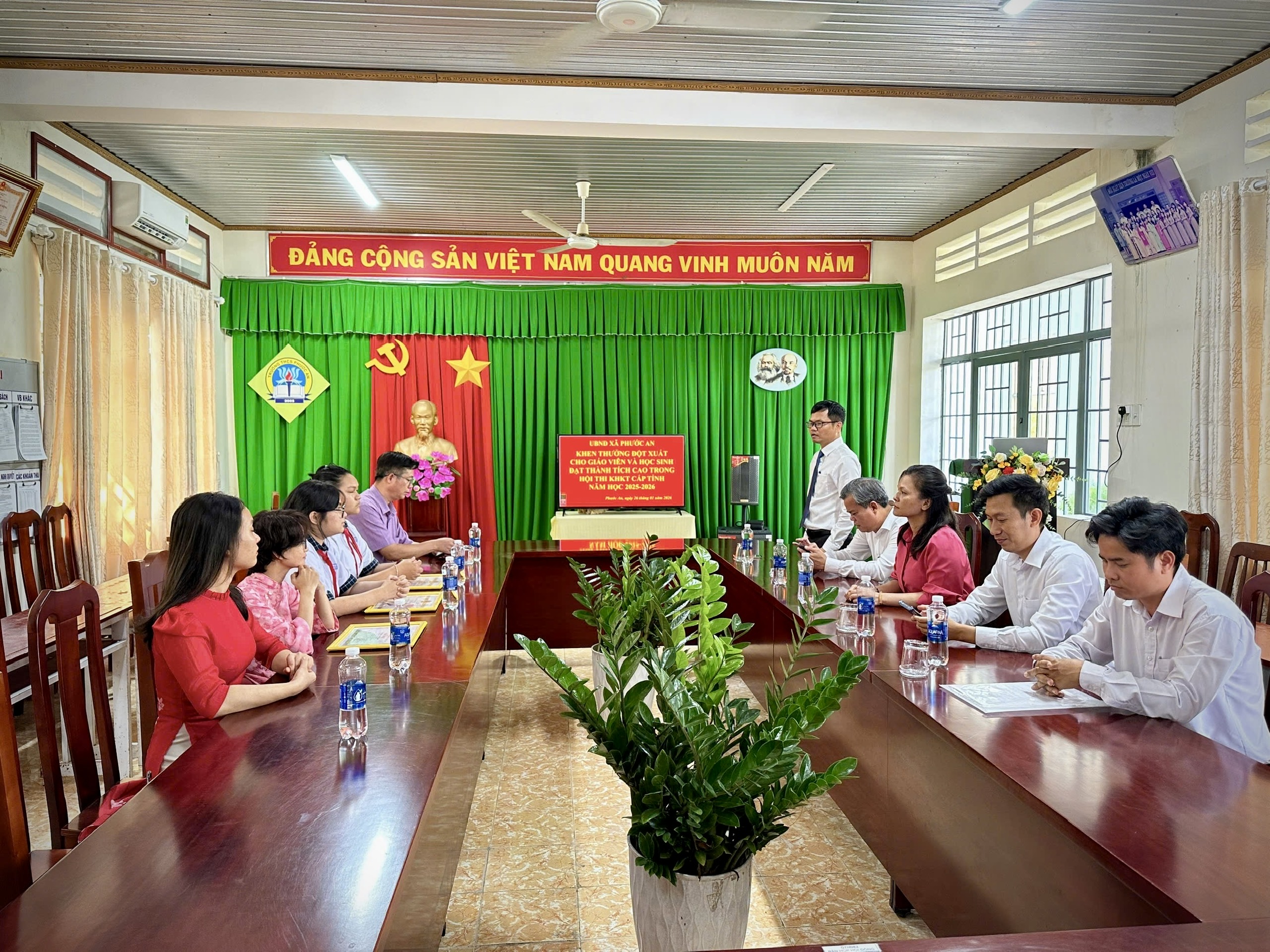 Sáng ngày 26/01/2026, Lãnh đạo UBND xã Phước An đã tổ chức buổi gặp mặt và trao quyết định khen thưởng đột xuất cho nhóm tác giả và giáo viên hướng dẫn trường THCS Phước An đạt thành tích xuất sắc cho cuộc thi Khoa học kỹ thuật cấp tỉnh dành cho học sinh THCS và THPT năm học 2025 -2026. Đây là sự ghi nhận kịp thời đối với thành tích xuất sắc đạt Giải Ba tại Cuộc thi nêu trên.
