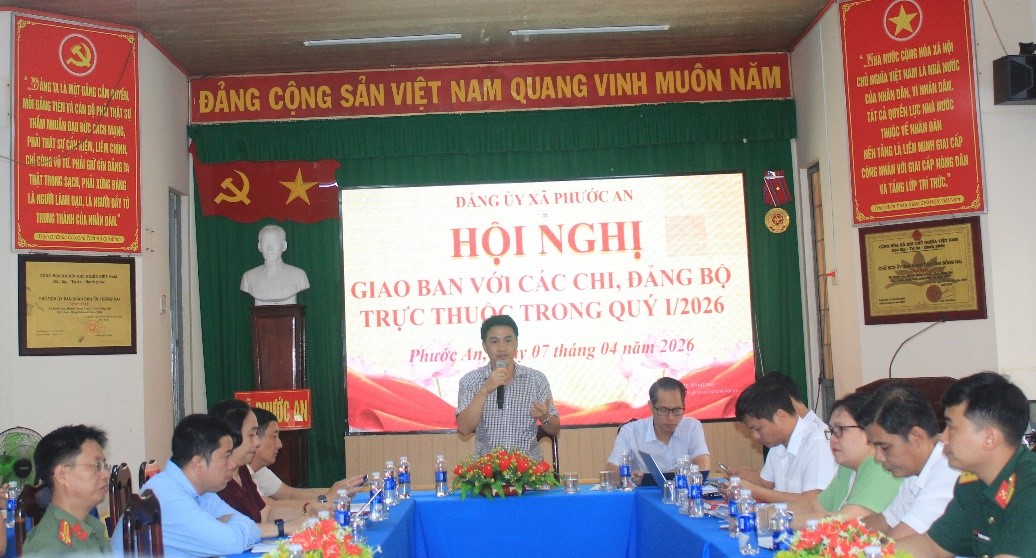 Sáng ngày 7-4, Đảng ủy xã Phước An tổ chức Hội nghị giao ban với chi, đảng bộ trực thuộc quý I năm 2026. Đồng chí Đỗ Huy Khánh, Bí thư Đảng ủy, Chủ tịch HĐND xã dự và chủ trì Hội nghị. Cùng dự Hội nghị còn có đồng chí Phạm Sỹ Linh, Phó Bí thư Thường trực Đảng ủy, Huỳnh Minh Đức, Phó Bí thư, Chủ tịch UBND xã; lãnh đạo các cơ quan, đơn vị và các đồng chí Bí thư các chi, đảng bộ trực thuộc Đảng ủy xã.