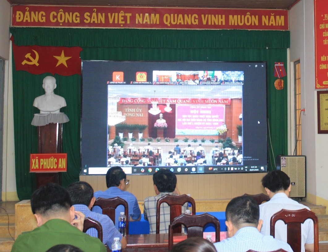 Sáng ngày 9-1, tại Hội trường UBND xã Phước An, gần 100 cán bộ lãnh đạo và công chức xã Phước An đã tham dự hội nghị trực tuyến quán triệt Nghị quyết Đại hội Đảng bộ tỉnh Đồng Nai lần thứ I, nhiệm kỳ 2025-2030 và các kế hoạch của Ban Thường vụ Tỉnh ủy do Tỉnh ủy Đồng Nai tổ chức bằng hình thức trực tiếp và trực tuyến.